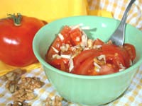 Помидоры промыть, обсушить и нарезать ровными дольками. Часть орехов (примерно треть) измельчить в процессоре до мелкой крошки. Оставшуюся часть размять ножом, чтобы у вас получились довольно крупные кусочки. Добавить мелкую ореховую крошку к помидорам, встряхнуть миску, чтобы крошка проникла между дольками помидоров. Затем добавить крупную ореховую крошку. Чеснок мелко порубить, добавить в салат, приправить солью. Полить ложечкой оливкового масла и подавать на стол.