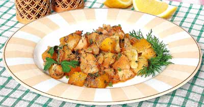 Выложите томаты в термоустойчивую посуду и запекайте в духовом шкафу 20-25 минут при t 150 с. Посолите рыбу, обваляйте ее в муке и стряхните лишнее. На сковороде обжарьте измельченный чеснок до золотистого цвета. На сковороду с чесноком выложите рыбу и обжарьте её с двух сторон на сильном огне, по минуте с каждой стороны. Переложите рыбу в огнеупорную посуду с высокими краями предварительно смазанную оливковым маслом. Выньте помидоры из духовки, положите их между кусочками рыбы. Залейте рыбу и помидоры водой и вином. Посолите по вкусу и тушите на медленном огне 15-20 минут. Готовое блюдо украсьте измельченной петрушкой.