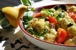Жаркое овощное с сухариками капуста цветная - 400 гр кукуруза консервированная - 200 гр сыр твердый - 70 гр помидоры - 4 шт чеснок - 2-3 зубчика растительное масло - 1 ст.л. сливочное масло - 1 ст.л. сухари панировочные - 100 гр соль - по вкусу зелень - любая |